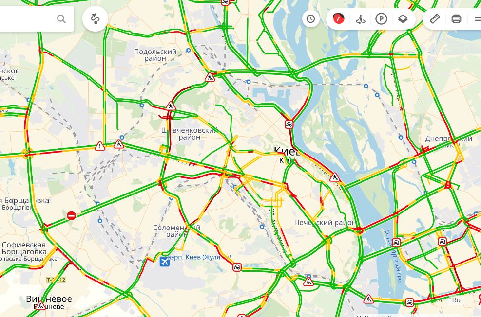 Сегодня, 11 мая, с утра пробки в Киеве достигли уровня 7 баллов при максимальной отметке в 10 баллов. Об этом сообщают сервисы Google Maps, а также Яндекс.Пробки.