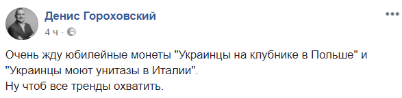 "Очень жду юбилейные монеты "Украинцы на клубнике в Польше" и "Украинцы моют унитазы в Италии". Ну чтоб все тренды охватить", - написал блогер Денис Гороховский.