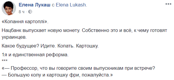 "Нацбанк выпускает новую монету. Собственно это и всё, к чему готовят украинцев. Какое будущее? Идите. Копать. Картошку. 1я и единственная реформа", - пишет в Facebook адвокат Елена Лукаш.