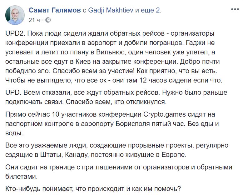 "Прямо сейчас 10 участников конференции Crypto.games сидят на паспортном контроле в аэропорту Борисполя пятый час. Без еды и воды. Все это уважаемые люди, создающие прорывные проекты, регулярно ездящие в Штаты, Канаду, постоянно живущие в Европе. Они сидят на границе с приглашениями от организаторов и обратными билетами. Кто-нибудь понимает, что происходит и как им помочь?", - написал Галимов.