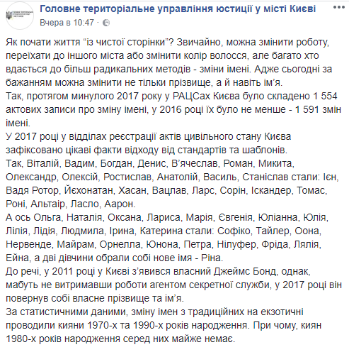 Всего за 2017 год 1 тысяч 554 киевлян обрели новые имена.