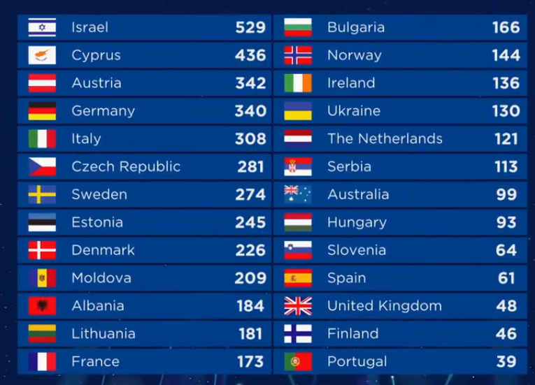 Согласно голосованию жюри и зрителей, представительница Израиля набрала 529 голосов в финале конкурса.