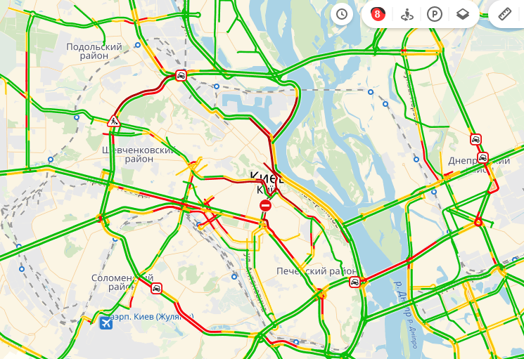 Также пробки есть на улицах Владимирская, Михаила Грушевского, других улицах в центре столицы.