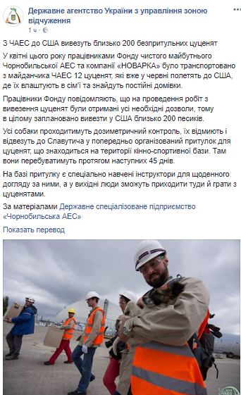 "В апреле работники Фонда чистого будущего, Чернобыльской АЭС и компании "НОВАРКА" уже транспортировали 12 щенков с площадки ЧАЭС. И в июне они полетят в США, где их устроят в семьи и найдут им постоянные дома. Работники Фонда сообщают, что на проведение работ по вывозу щенков были получены все необходимые разрешения, и в целом запланировано вывезти в США около 200 щенков", - говорится в сообщении.