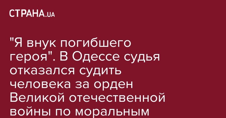 "Я, ЛИЦО_3, являюсь внуком героически погибшего во время Великой Отечественной войны ЛИЦО_4 и внуком кавалера двух орденов "Отечественная война", инвалида Великой Отечественной войны 1 группы ЛИЦО_5. В силу этих обстоятельств, а также в связи с воспитанием меня в духе уважения к воинам, которые своими героическими подвигами и мужеством отстояли в тяжелых боях право народа Украины на жизнь и в духе уважения к героизму нашего народа во время Великой Отечественной (Второй мировой) войны, его несгибаемой стойкости в борьбе с нацизмом, я не могу расценивать факт демонстрации изображения ордена "Отечественная война" в дни празднования народного и государственного праздника "День Победы" как пропаганду тоталитарного режима, поэтому считаю невозможным из личных и морально-этических соображений осуществлять рассмотрение указанного ходатайства", - говорится в решении суда.