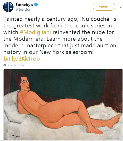 "Шедевр Амедео Модильяни 1917 года "Лежащая обнаженная" продан за 157,2 млн долл - самую высокую аукционную цену в истории Sotheby's", - говорится в сообщении.