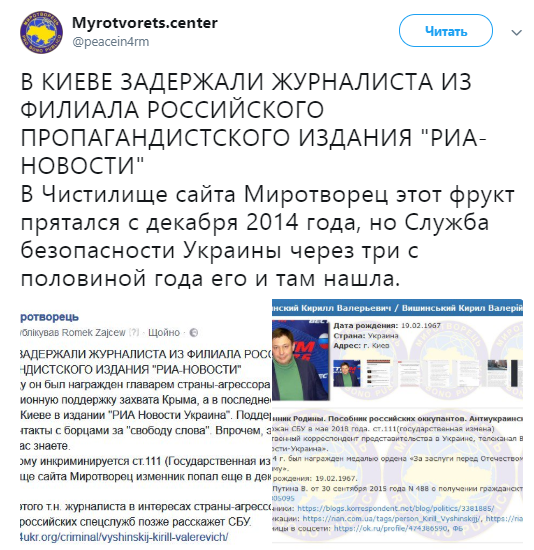 Задержанный руководитель "РИА Новости Украина" Кирилл Вышинский был внесен в раздел "Чистилище" сайта "Миротворец" за антиукраинскую пропаганду с 2014 года.