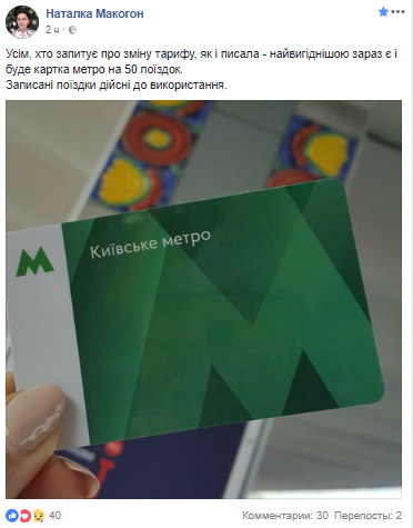 "Всем, кто спрашивает про смену тарифа, как и писала - самой выгодной сейчас является и будет карточка метро на 50 поездок. Записанные поездки действительны до списания", - отметила она.