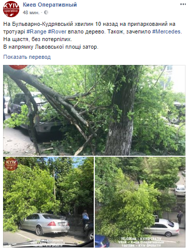 "На Бульварно-Кудрявской минут 10 назад на припаркованный на тротуаре #Range Rover упало дерево. Также, задело #Mercedes. К счастью, без пострадавших.