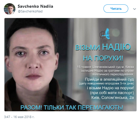 В соцсетях активно распространяется информация об акции под названием "Візьми Надію на Поруки!". Всех желающих приглашают прийти в Шевченковский суд Киева с паспортом и заявить о намерении взять на поруки подозреваемого в организации теракта и арестованного нардепа Надежду Савченко.