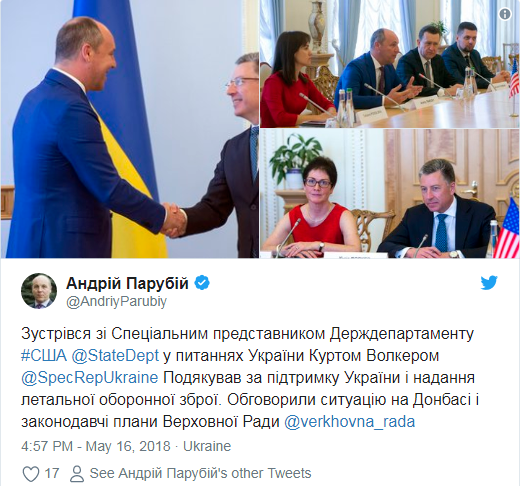 "Встретился со специальным представителем Госдепартамента США по вопросам Украины Куртом Волкером. Поблагодарил за поддержку Украины и предоставление летального оборонительного оружия. Обсудили ситуацию на Донбассе и законодательные планы Верховной Рады", - написал Парубий в Twitter.