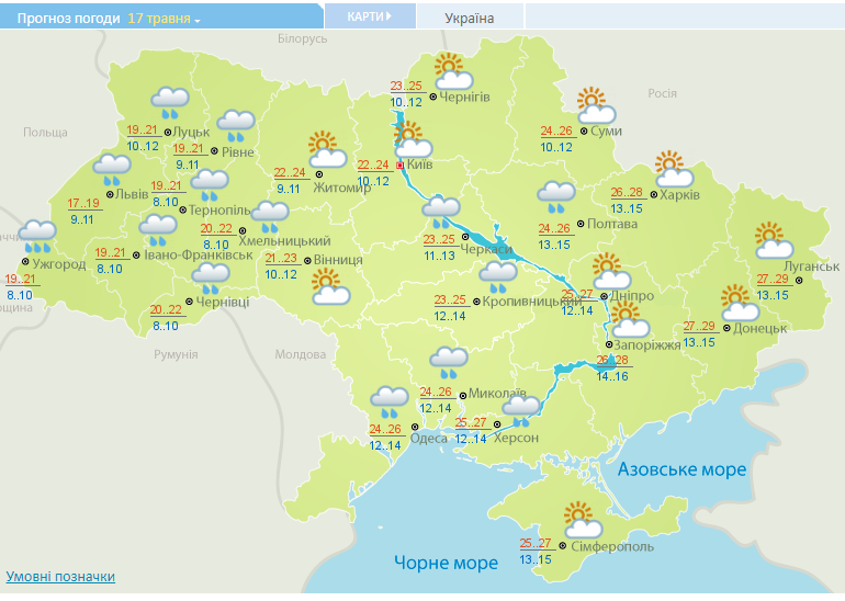 В четверг, 17 мая, синоптики обещают дожди во всех регионах, кроме востока и севера. В западных, южных и центральных областях местами гроза, днем местами шквалы 15-20 м/с; в Карпатах и на Закарпатье сильные дожди. Днем от +17 до +29.