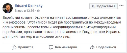 "Еврейский комитет Украины начинает составление списка антисемитов и ксенофобов. Этот список будет распространяться по международным организациям, посольствам и координироваться с международными еврейскими, правозащитными организациями и Государством Израиль для принятия мер в отношении этих лиц", - написал он.