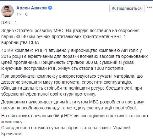 "40 мм комплекс РПГ-1 запущен в производство компанией AirTronic в 2016 году. Он является эффективным для поражения огневых средств и бронированных целей противника. Прицельность стрельбы 800 м, совместимый со всеми существующими выстрелами РПГ, живучесть ствола 1000 выстрелов", - написал министр.