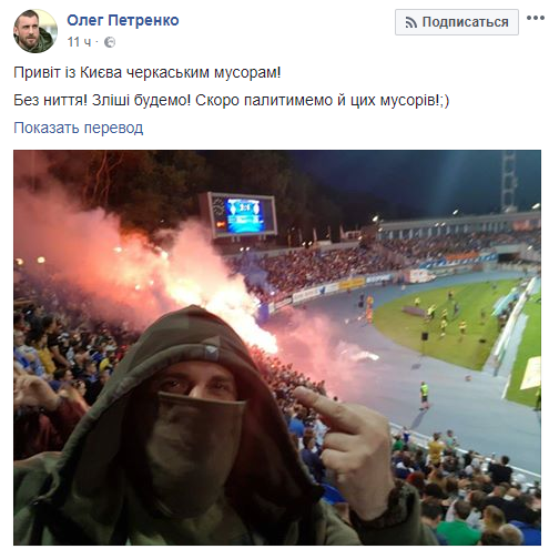 "Привет из Киева черкасским мусорам! Без нытья! Злее будем! Скоро будем жечь и этих мусоров", – подписал он фото с трибуны стадиона имени Лобановского на фоне зажженных петард и файеров.