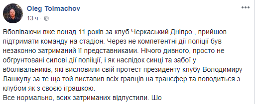 "Болея уже более 11 лет за "Черкасский Днепр", пришел поддержать команду на стадион. Из-за некомпетентных действий полиции был незаконно задержан ее представителями. Ничего удивительного, просто не обоснованные силовые действия полиции, и, как следствие, синяки и ушибы у болельщиков, которые выразили свой протест президенту клуба Владимиру Лашкулу за то, что тот выставил всех игроков на трансфер и обращается с клубом как со своей игрушкой", - написал Толмачев и добавил, что всех задержанных отпустили.