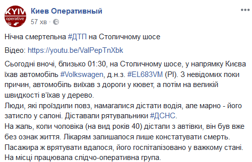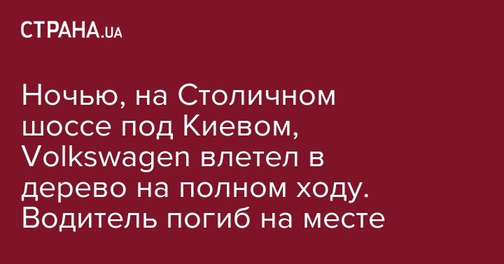 Ночью, на Столичном шоссе под Киевом, Volkswagen влетел в дерево на полном ходу. Водитель погиб на месте
