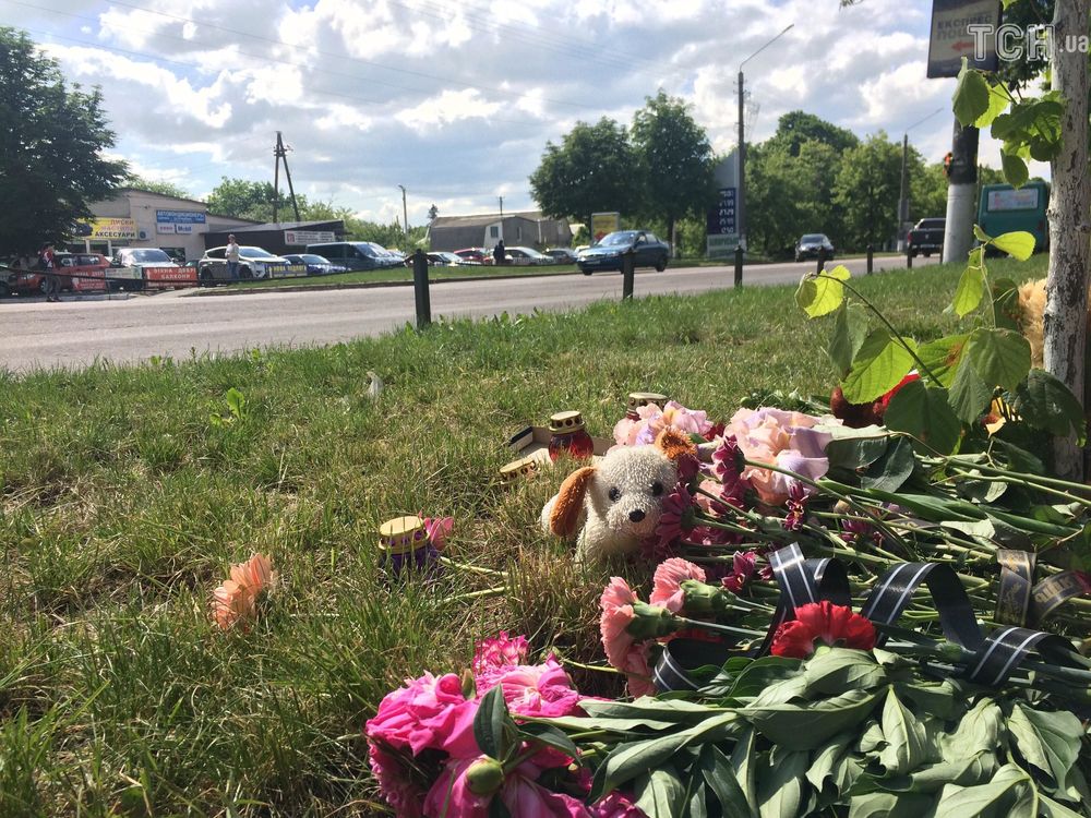 На место ДТП со школьницами, в Борисполе Киевской области люди несут цветы и детские игрушки.