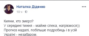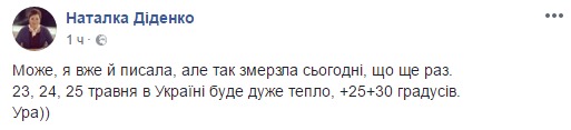 Позже она уточнила, что 23, 24, 25 мая в Украине будет очень тепло, + 25 + 30 градусов.