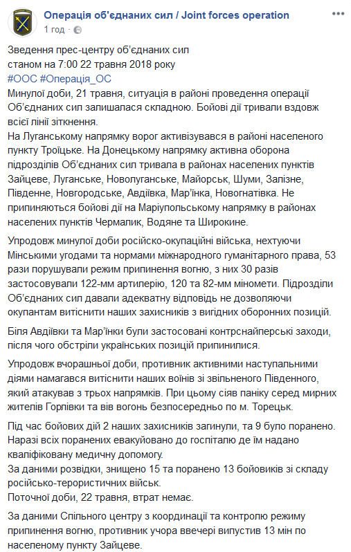 Во время боевых действий два наших защитника погибли и девять были ранены. Сейчас всех раненых эвакуировали в госпиталь, где им оказана медицинская помощь", - заявили в штабе ООС.