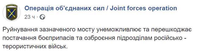 "Разрушение указанного моста исключает и препятствует поставкам боеприпасов и вооружения подразделениям российско-терористических войск", – говорится в посте.