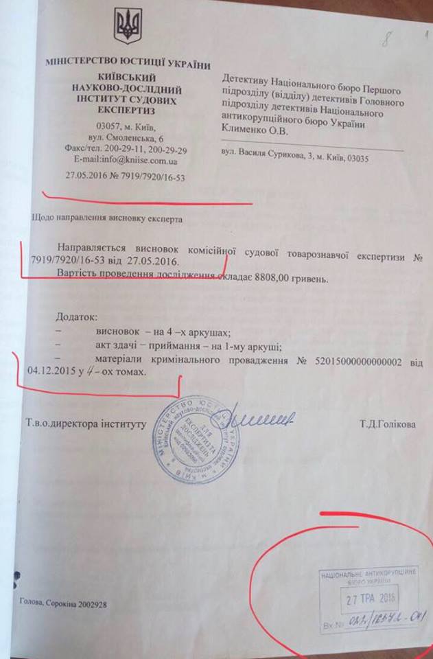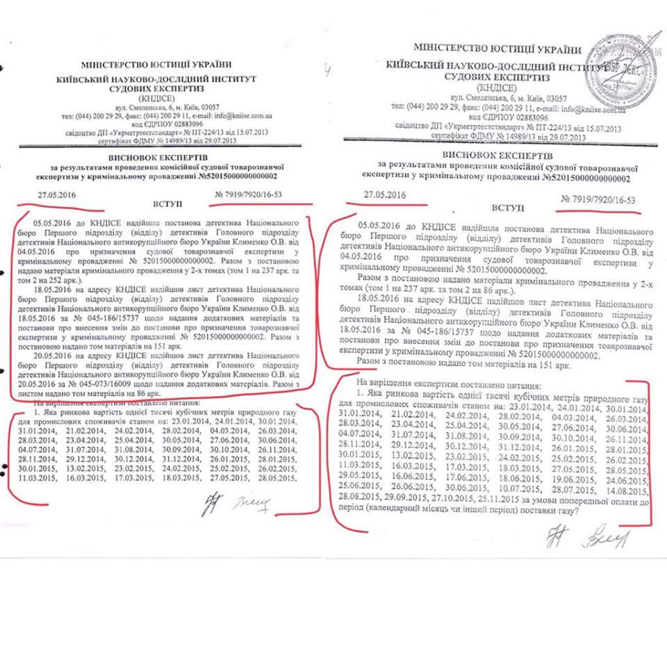 "Это документы, на которых покойный судья Бобровник (судья Андрей Бобровник умер на прошлой неделе - Прим.Ред.) выносил судебные решения. Экспертиза это главный документ, на основе которого базируется все обвинение. Однако выяснилось, что в деле под одним тем же номером существует две разные экспертизы, и все это зафиксировано печатью НАБУ", - комментирует он, обращая внимание, что под одним и тем же исходящим номером и датой не может проходить два идентичных по форме, но разных по сути документа.