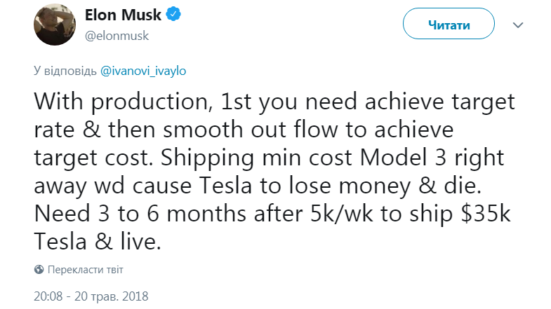 "Первым делом нужно достигнуть целевого показателя по выпуску, а затем сгладить его для достижения целевой стоимости. Минимальная цена на Model 3 заставляет компанию терять деньги и гибнуть. На протяжении 3-6 месяцев нам нужно выпускать по 5 тысяч Model 3 в неделю по $35 тыс (за машину - Прим.Ред.) и жить", - написал он.