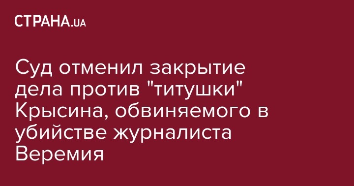 Печерский районный суд Киева отменил постановление Генеральной прокуратуры о закрытии уголовного производства против руководителя "титушек" Юрия Крысина, которого обвиняют в убийстве журналиста Вячеслава Веремия 18 февраля 2014 в центре Киева. Об этом на своей странице в соцсети сообщила адвокат семей пострадавших активистов Евгения Закревская.