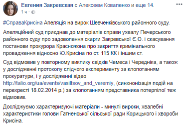 По ее словам, Апелляционный суд присоединил к материалам дела постановление Печерского районного суда об удовлетворении ее жалобы и отмене постановления прокурора Красножона о закрытии уголовного производства в отношении Юрия Крысина по статье об убийстве (ст.115 Уголовного кодекса Украины)
