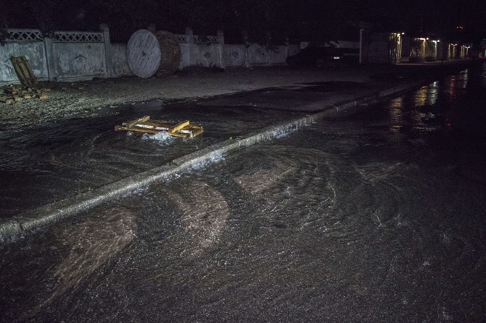 Издание пишет, что коммунальщиков на месте порыва нет, а дыру, из которой бьют потоки, просто прикрыли досками. На улице уже образовались километровые лужи.