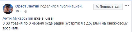 "Уже в Киеве! С 30 мая по 3 июня будет рад встретиться с друзьями на Книжном арсенале", - написал Мухарский и опубликовал фото из столицы.