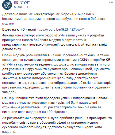 В Черниговской области провели испытания нового боевого модуля, который способен поражать неподвижные и движущиеся бронированные цели с разными типами брони. Об этом сообщает пресс-служба конструкторского бюро "Луч" на своей странице в Facebook.