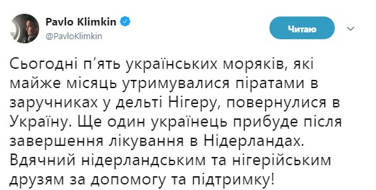 "Сегодня пять украинских моряков, которые почти месяц удерживались пиратами в заложниках в дельте Нигера, вернулись в Украину. Еще один украинец прибудет после завершения лечения в Нидерландах", - написал министр.