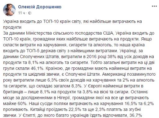 "Наши соседи поляки тратят на питание 16,5% и 6,2% пропивают. Китайцы проедают 22,5% и еще 2,3% платят за пагубные привычки. В Египте, к которому многие украинцы ездят отдыхать, 36,7% доходов тратится на еду и 4,5% на табак. Как сказал бы один известный человек в нашей стране – больше украинцев любят есть и пить только нигерийцы, кенийцы и камерунцы. Но только за счет питания, поскольку затраты на горячительные напитки и курение в них в разы меньше", - подчеркивает он.
