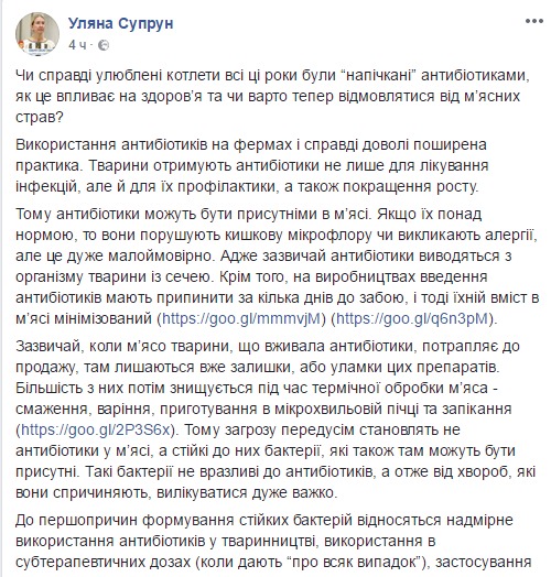 Поэтому антибиотики могут присутствовать в мясе, которое мы покупаем. Об этом на своей странице в Facebook сообщила и.о. главы Минздрава Ульяна Супрун.