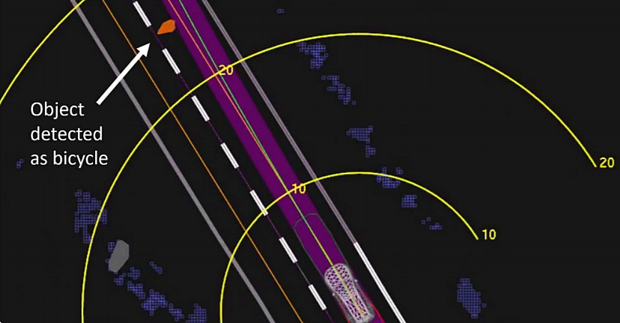 Первыми пешехода обнаружили лидар и радар, это произошло за шесть секунд до столкновения. Изначально автомобиль классифицировал ее как неопознанный объект, затем как автомобиль, а после как велосипед (пешеход переходила дорогу, толкая рядом с собой велосипед с пластиковыми пакетами).