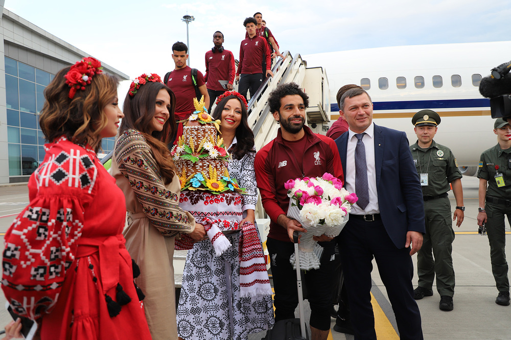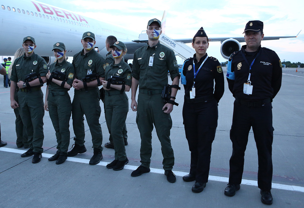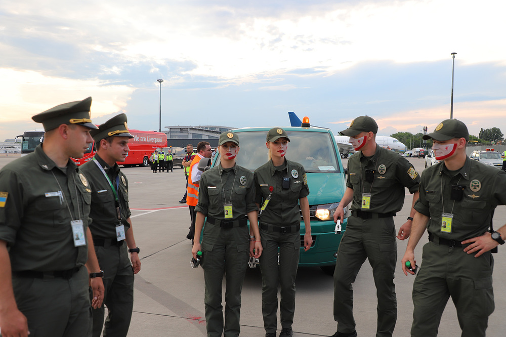 Футболистов Реала и Ливерпуля, участников финального матча Лиги чемпионов УЕФА, которые прибыли в Киев 24 мая вечером, встречали украинские пограничники, лица которых были раскрашены в цвета флагов двух команд-финалистов.