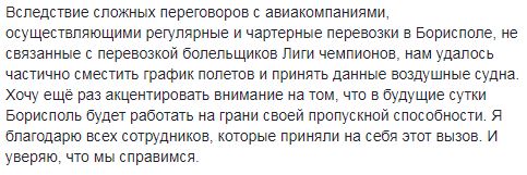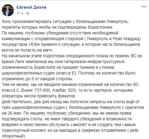 "Хочу прокомментировать ситуацию с болельщиками Ливерпуля, перелеты которых якобы не подтверждены "Борисполем". По нашему глубокому убеждению, отсутствие необходимой коммуникации с отправляющей стороной ("Ливерпуль" и "Реал Мадрид") посредством УЕФА привело к ситуации, в которой часть болельщиков могла не попасть на матч", - отметил он.