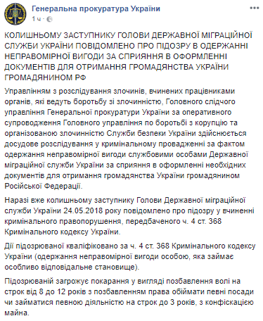"Сейчас уже бывшему заместителю Председателя Государственной миграционной службы Украины 24.05.2018 года сообщено о подозрении в совершении уголовного преступления, предусмотренного ч. 4 ст. 368 Уголовного кодекса Украины. Действия подозреваемого квалифицированы по ч. 4 ст. 368 Уголовного кодекса Украины (получение неправомерной выгоды лицом, занимающим особо ответственное положение)", - говорится в сообщении в соцсети.