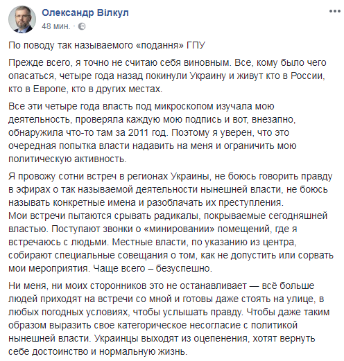 Алесандр Вилкул акцентировал внимание, что рассматривает "подання", как очередное действие власти, направленное на ограничение его политической активности.