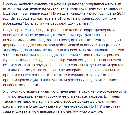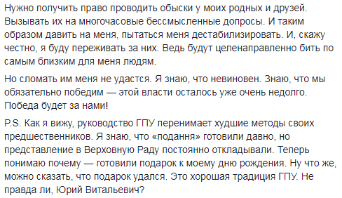"P.S. Как я вижу, руководство ГПУ перенимает худшие методы своих предшественников. Я знаю, что "подання" готовили давно, но представление в Верховную Раду постоянно откладывали. Теперь понимаю почему - готовили подарок к моему дню рождения. Ну что же, можно сказать, что подарок удался. Это хорошая традиция ГПУ. Не правда ли, Юрий Витальевич?", - указано в опубликованном сообщении.