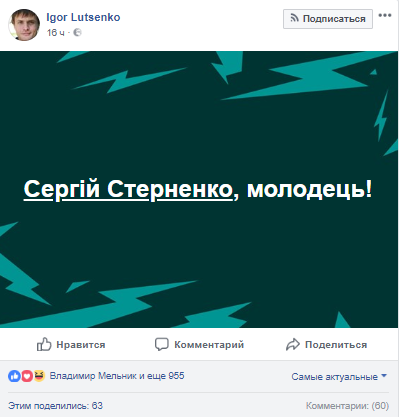 "Сергей Стерненко, молодец!" - написал народный депутат.