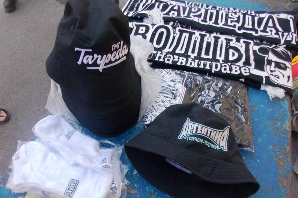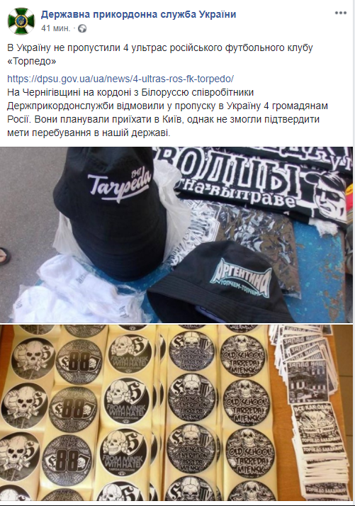 "В ходе совместного с представителями таможни осмотра в них была найдена символику с агрессивными элементами изображения фанатов - ультрас футбольного клуба", - отметили в Госпогранслужбе.