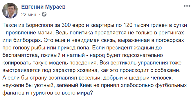 "Такси из Борисполя за 300 евро и квартиры по 120 тысяч гривен в сутки - проявление магии. Ведь политика проявляется не только в рейтингах или билбордах. Это еще и невидимая связь, выраженная в поговорках про голову рыбы или приход попа. Если президент жадный до беспамятства, лживый и наглый - народ будет подсознательно копировать такую модель поведения. Вся вертикаль управления тоже выстраивается под характер хозяина, как это происходит с собаками.