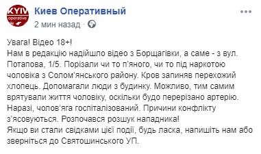 "Порезали то пьяного, то ли под наркотой человека с Соломенского района. Кровь останавливал прохожий парень. Помогали люди из дома. Возможно, тем самым спасли жизнь мужчине, поскольку была перерезана артерия", - сказано в сообщении.