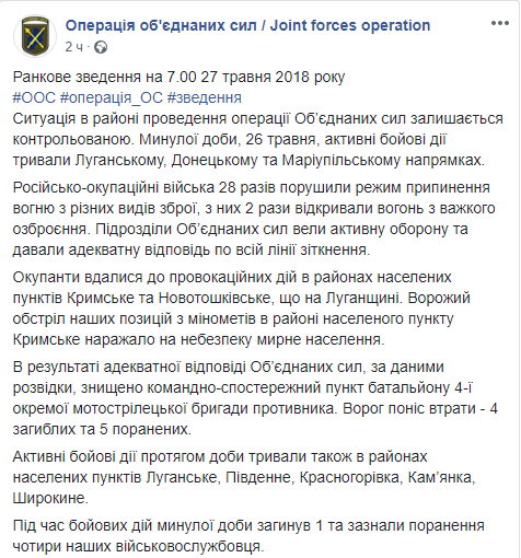 "Во время боевых действий за прошедшие сутки погиб один и получили ранения четверо наших военнослужащих", - отметили в пресс-центре.