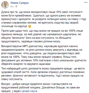 "Кажется, что однажды утром можно проснуться и понять, как раскрыть потенциал мозга по полной. И тогда станем настоящими гениями, которые спасут человечество от болезней, преступников и коррупции. Используя МРТ-диагностику, ученым удалось наглядно продемонстрировать, как различные участки мозга реагируют в ответ на различные раздражители, четко доказывая, что человек использует свой мозг на 100%. Поэтому наш мозг работает исправно, более того, фиксирование этих активных 10% связано с его уникальной способностью сохранять энергию и управлять задачами. Поэтому лучший путь помочь мозгу работать лучше - это вести здоровый образ жизни. Когда организм получает достаточно питательных веществ, физической активности и отдыха, тогда и мозг работает на полную мощность", - написала Супрун.