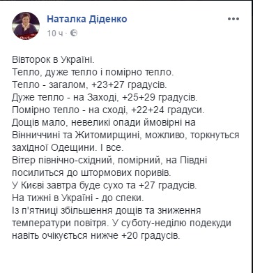 Во вторник, 29 мая, в Украине тепло, очень тепло и умеренно тепло. Об этом на своей странице в Facebook написала синоптик Наталья Диденко. Очень тепло – на западе, +25-29 градусов. Умеренно тепло – на востоке, +22-24 градуса.