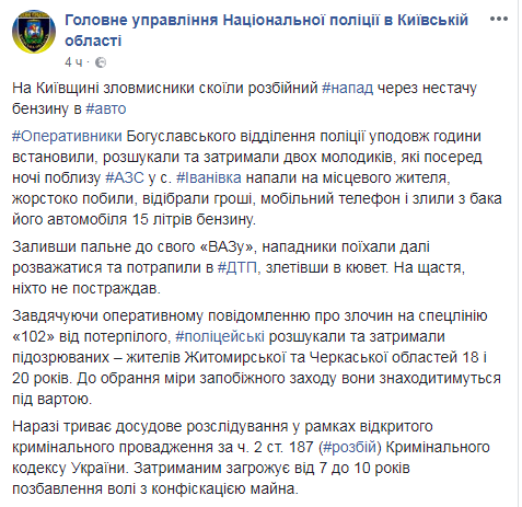 В Киевской области в селе Ивановка злоумышленники совершили разбойное нападение вблизи АЗС. Они хотели заправить свой автомобиль бензином местного жителя.