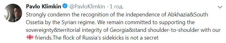 "Решительно осуждаю признание сирийским режимом независимости Абхазии и Южной Осетии. Мы остаемся верными поддержке суверенитета и территориальной целостности Грузии и неизменно стоим плечом к плечу с нашими грузинскими друзьями. Стая союзников РФ всем давно известна".